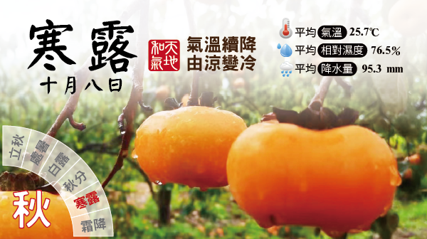 寒露期間本局全臺平地測站,1981~2010 共30 年平均之平均氣溫約25.7℃、平均最高氣 溫約29.3℃、平均最低氣溫約22.9℃、平均相對濕度約76.5%、10 月上半月累積平均降 水量約95.3 mm、10 月上半月累積平均降水日數約5.0 天。