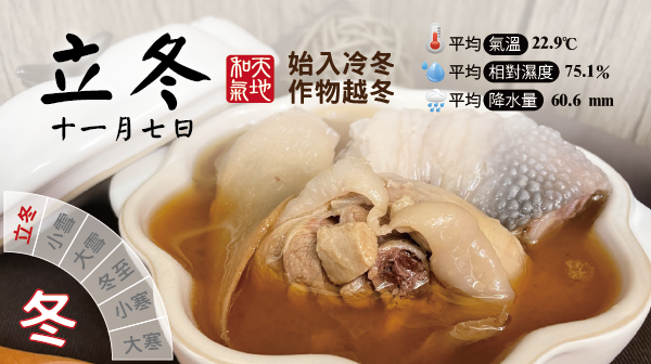 秋去冬來,冬季以立冬為揭開的序幕。在臺灣,「立冬」未必會感覺到非常寒冷,有時候甚至還會出現幾天的大太陽,天氣炎熱,所以有「十月小陽春」之稱,不過這裡的十月是指農曆的十月!立冬意指一年辛勞,歷經寒暑,體力衰弱,必須透過進補恢復元氣,因此才有「立冬日要進補」的補冬一說。