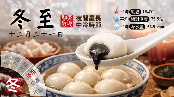 冬至,是二十四節氣中的第 22 個節氣,一般落在每年 12 月 21~23 日。它的特色、文化意義非常豐富,尤其在華人社會有「冬至大過年」的說法。俗稱"冬節",「至」是極之意,是說寒冷陰森的天氣達到了極點,通常過了這天,陽氣初萌,白晝便會逐漸增長,所謂「冬至陽生」,冬去春回的日子即將開始,此時太陽達赤道最南邊,這一天白天最短,黑夜最長。古代農耕時期,一年辛苦,期待秋收冬藏,穀物糧食積滿倉庫,人們在此時節休養進補恢復生息,準備過年的物品。