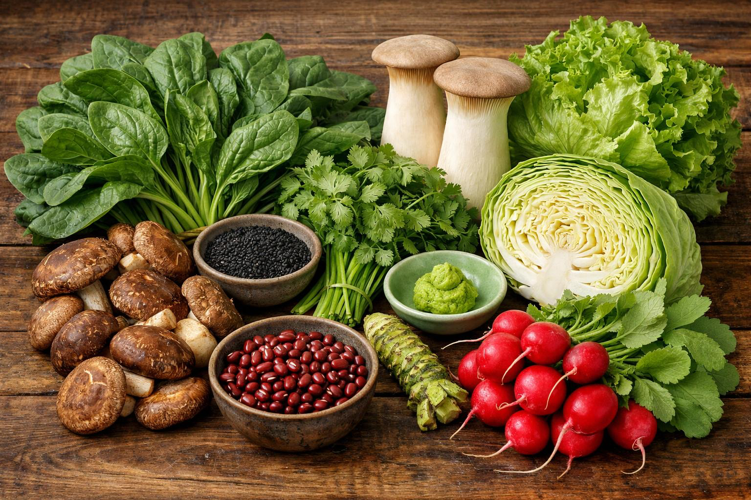 【盛產蔬菜】菠菜、香菇、芫荽、黑芝麻、杏鮑菇、高麗菜、結球萵苣、櫻桃蘿蔔、山葵、紅豆