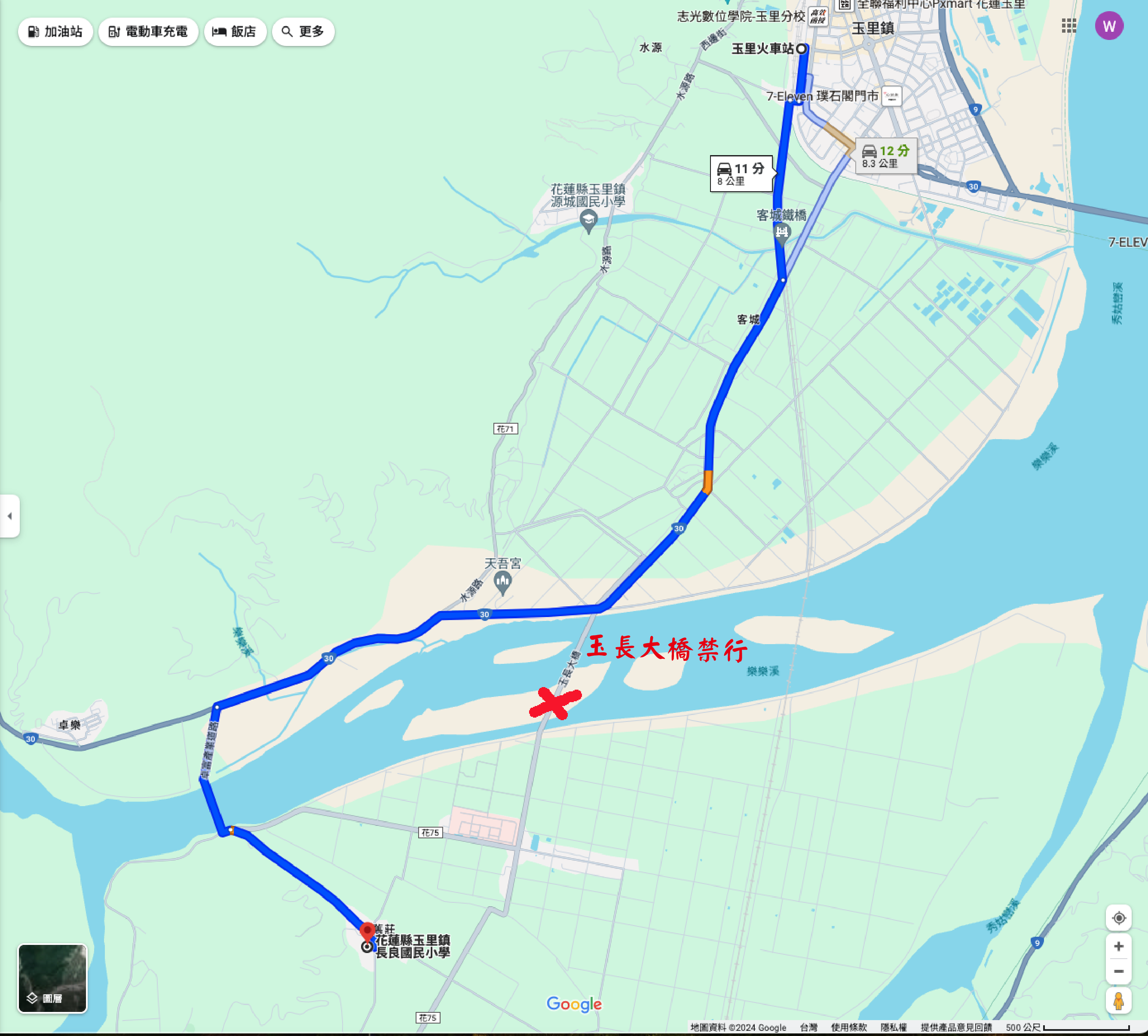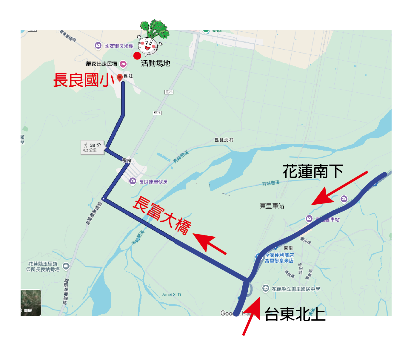 2) 從玉里南下至長良,須避開走玉長大橋(前年因地震中斷尚未修復),請改走卓富大橋,下橋後左轉直走(google導航錯誤,會指示右轉)。