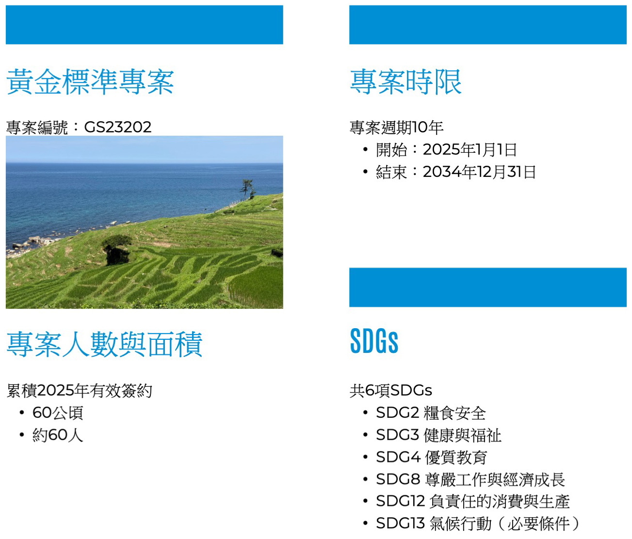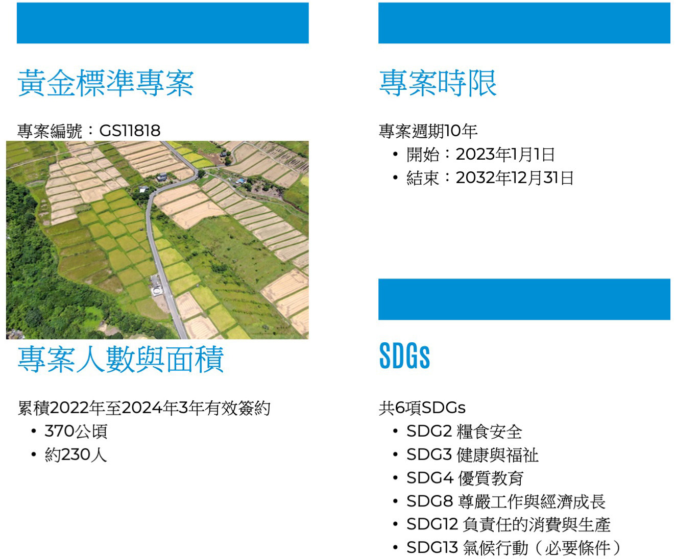 日益頻仍的氣候災難下,小農種碳專案已進入第4年,我們除了2023年開始的台灣小農種碳專案外,2024年開發了日本能登小農種碳專案,和台灣池上小農種碳專案,同時積極取得黃金標準設計與績效認證。