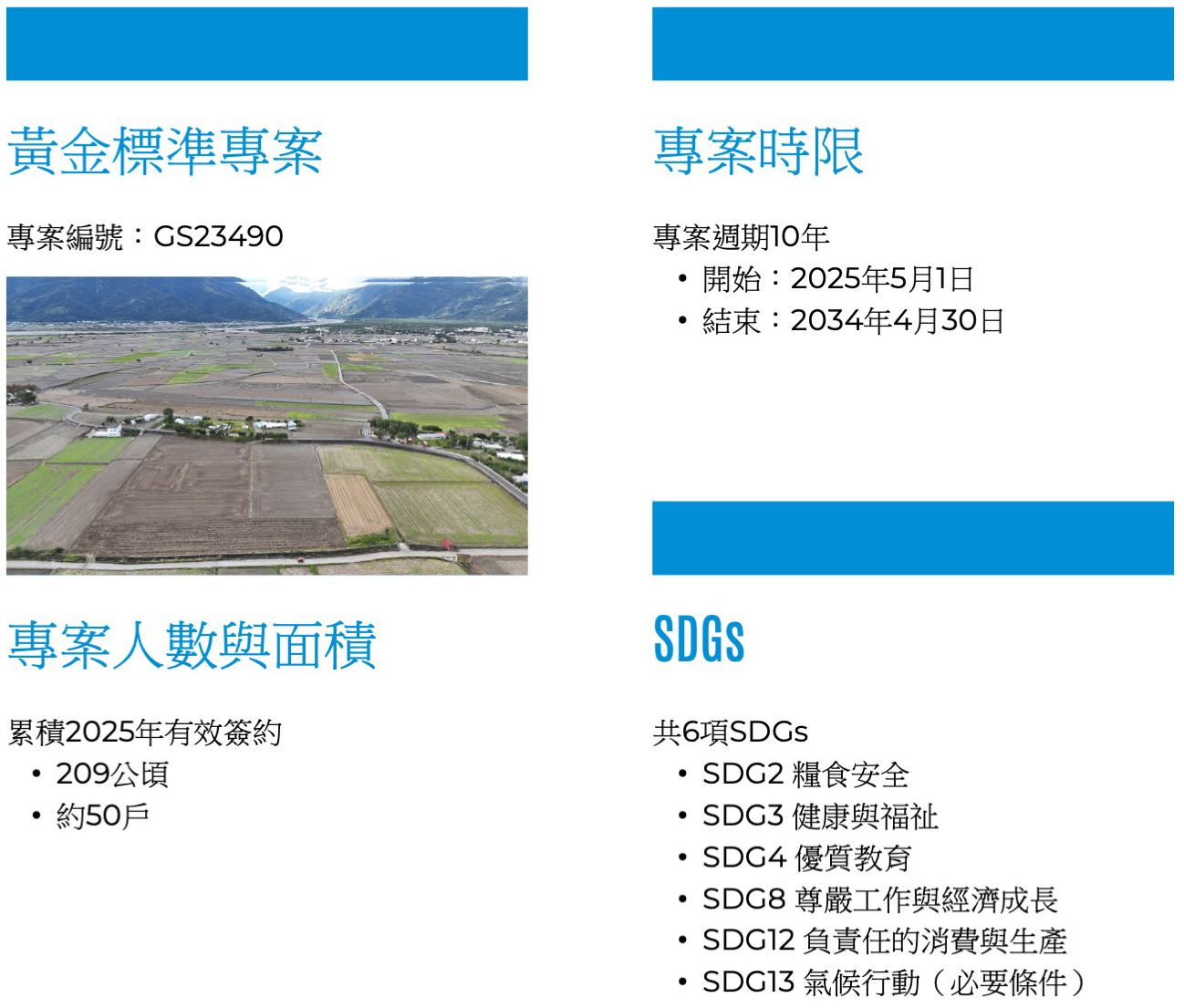 由台灣各種作物的小農組建而成,從2022年簽約,2023年2月通過黃金標準註冊至今,也是第一個小農種碳專案,而且逐年增加小農,這也造成了認證上的困難,必須等第一年的專案完全認證後,再進行後續新加入小農的認證。感謝大家耐心,因為我們是誠實,且公開透明,接受各界評審,我們也有信心可以完成。目前初步的績效驗算,成績應該是相當可觀的。