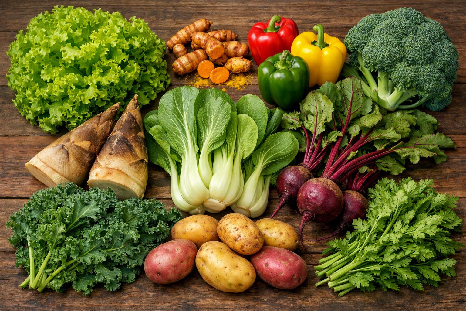 皺葉萵苣、薑黃、甜椒、綠花椰、冬筍、油菜、甜菜根、羽衣甘藍、馬鈴薯、茼蒿